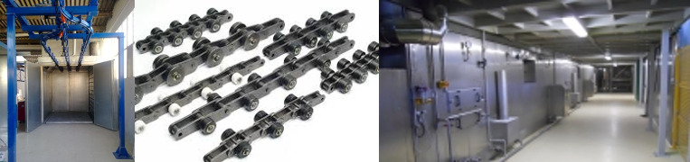 Cadenas de todo tipo de hornos. Hornos de Pintura Automotriz, Equipo de fabricación de componentes electrónicos, fabricación de pan y tortillas. Cadenas de Ramas textiles. Cadenas de entrega de equipo de impresión offset.